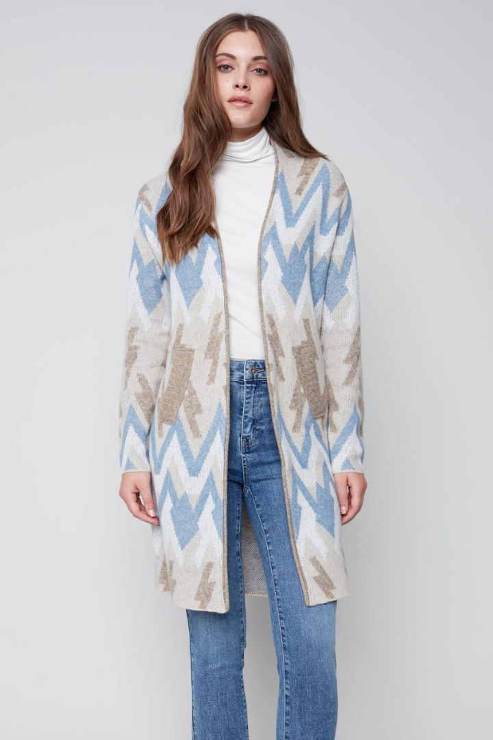 Elevate your wardrobe with the Jacquard Open Front Cardigan in Denim. Featuring a striking jacquard print in versatile neutral tones, this cardigan effortlessly blends style and comfort. Perfect for layering on any occasion, it adds a unique touch to your outfit while keeping you cozy. Make a memorable impression wherever you go with this standout piece.