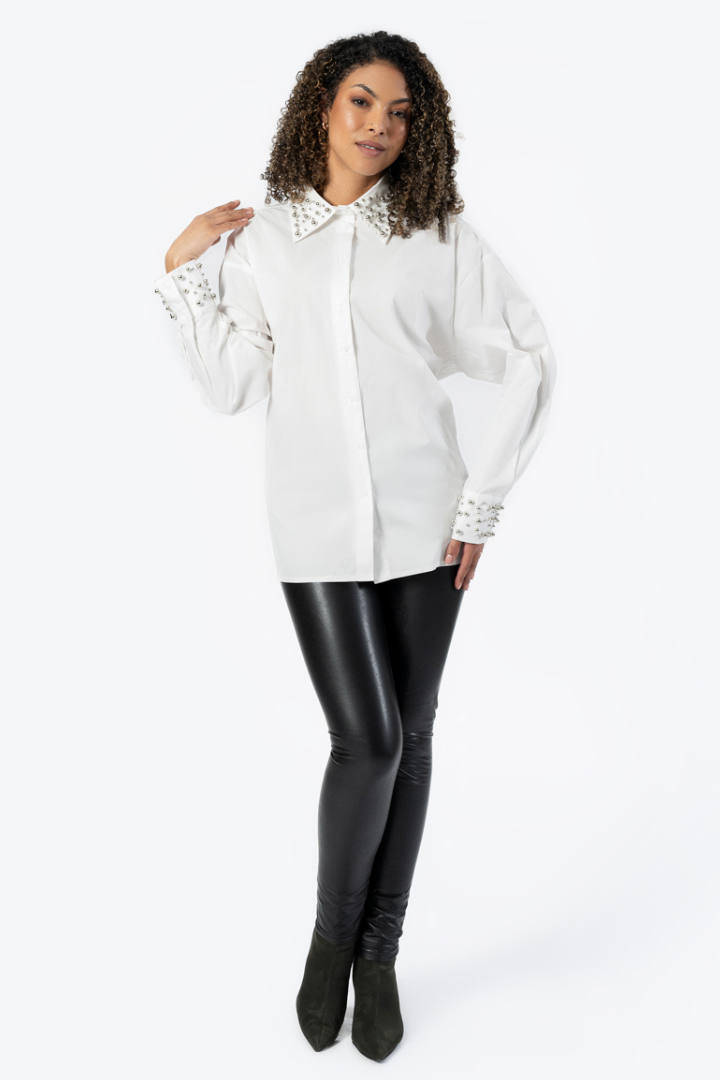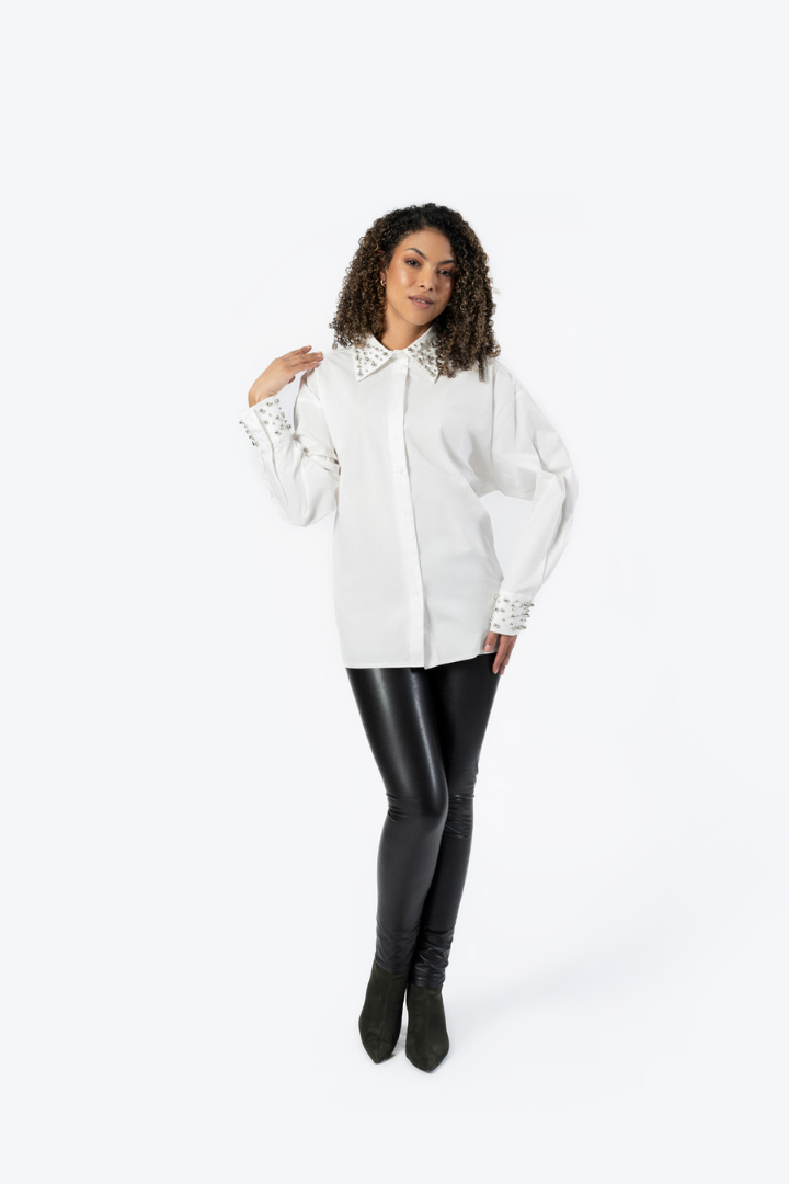 Regular price $130.00Elevate your wardrobe with this stunning Embellished Blouse in crisp white. Perfect for those moments when you want to look polished and put-together, this piece combines timeless elegance with refined details. The delicate embellishments add just the right touch of sophistication, making it ideal for dinners out, special occasions, or whenever you want to feel confident and chic. Versatile enough to dress up with tailored trousers or down with your favorite jeans, this classic blouse is an investment piece that will become a go-to favorite in your closet.