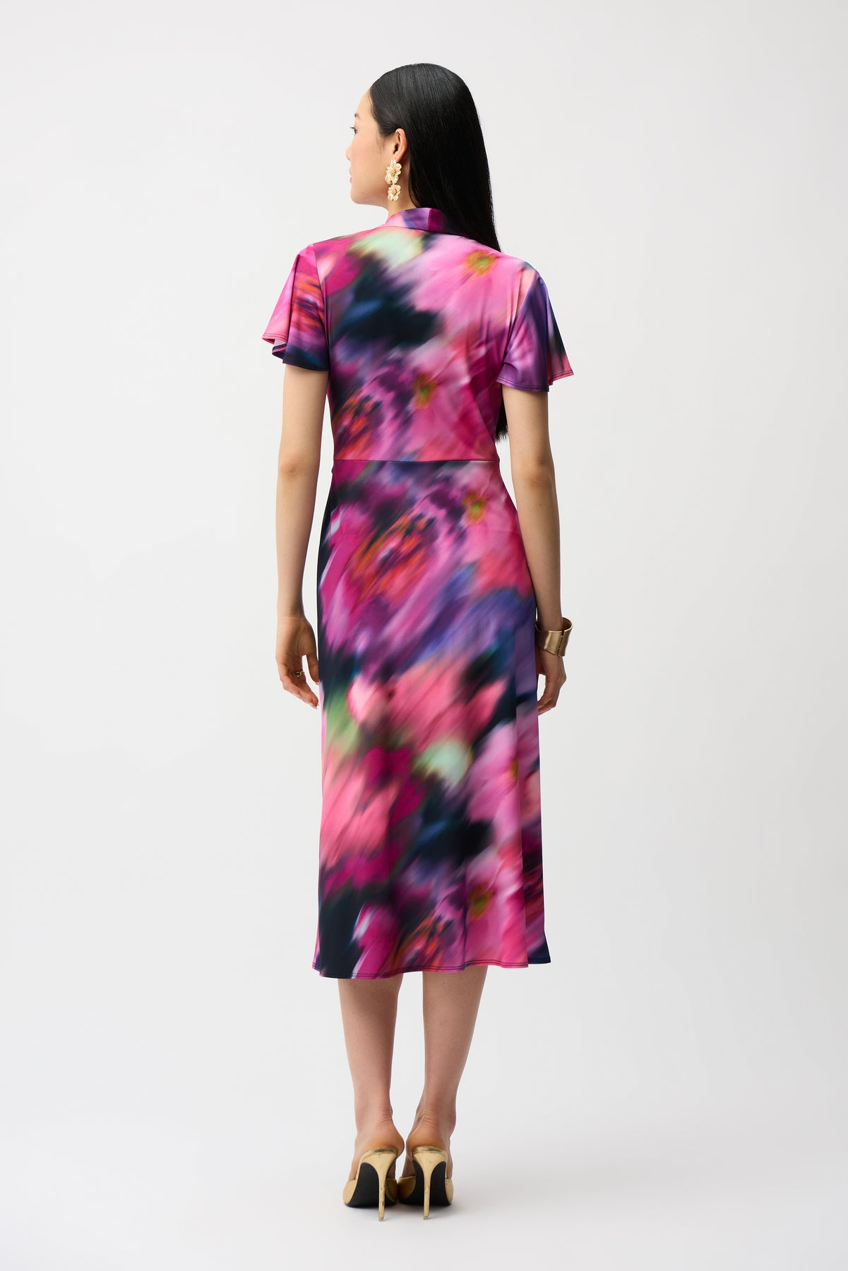 Discover effortless elegance with the Floral Print Flutter Sleeve Wrap Dress. This Joseph Ribkoff midi masterpiece combines romantic femininity with everyday versatility. The flattering wrap silhouette, delicate flutter sleeves, and refined ruching create a silhouette that flatters every figure. Perfect for garden parties, brunch dates, or weekend getaways, this dress transitions seamlessly from day to night.