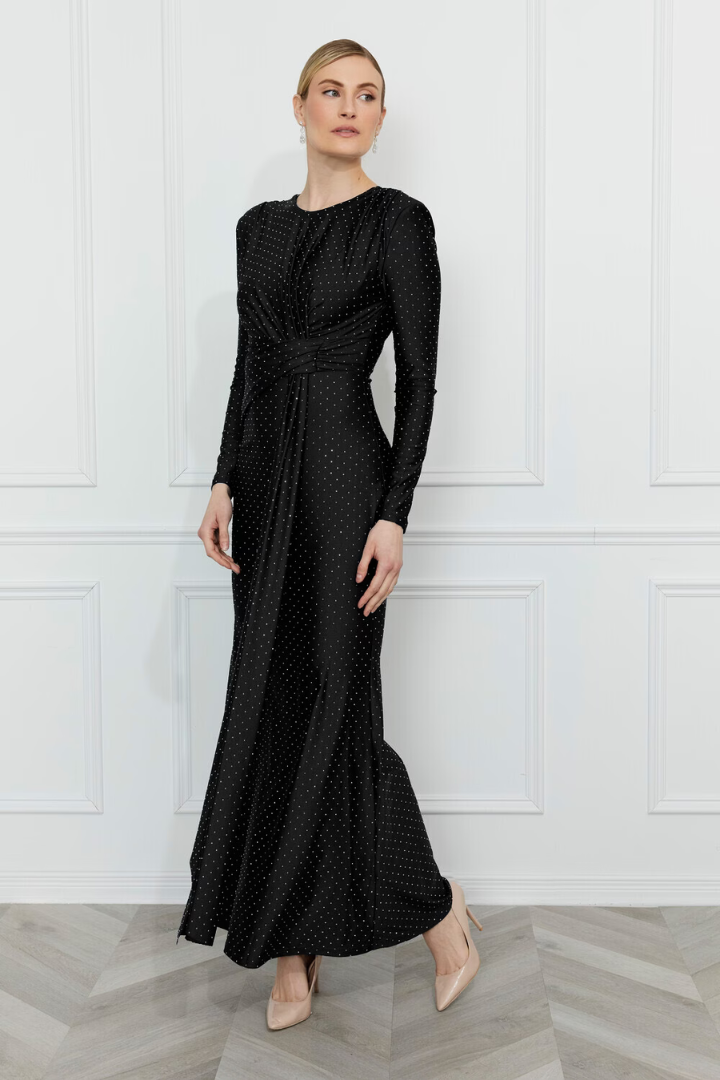 Elevate your formal wardrobe with this Frank Lyman embellished gown, a sophisticated choice for unforgettable evenings. The flattering fit-and-flare silhouette gracefully accentuates your figure, while intricate embellishments along the long sleeves add glamorous detail. Refined ruching enhances the elegant design, and the classic round neckline keeps the focus on the stunning craftsmanship. Whether you're attending a gala, wedding, or special celebration, this timeless piece delivers the polished, show-stopping look you deserve.