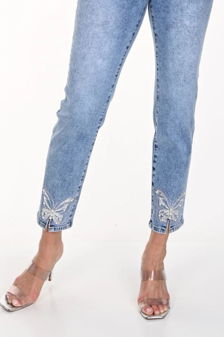 Regular price $193.81These jeans blend classic style with a charming twist thanks to the embellished butterfly detail at the hem. Featuring a typical jean design, they offer a familiar fit while adding a touch of super cute flair that makes them perfect for everyday wear with personality.