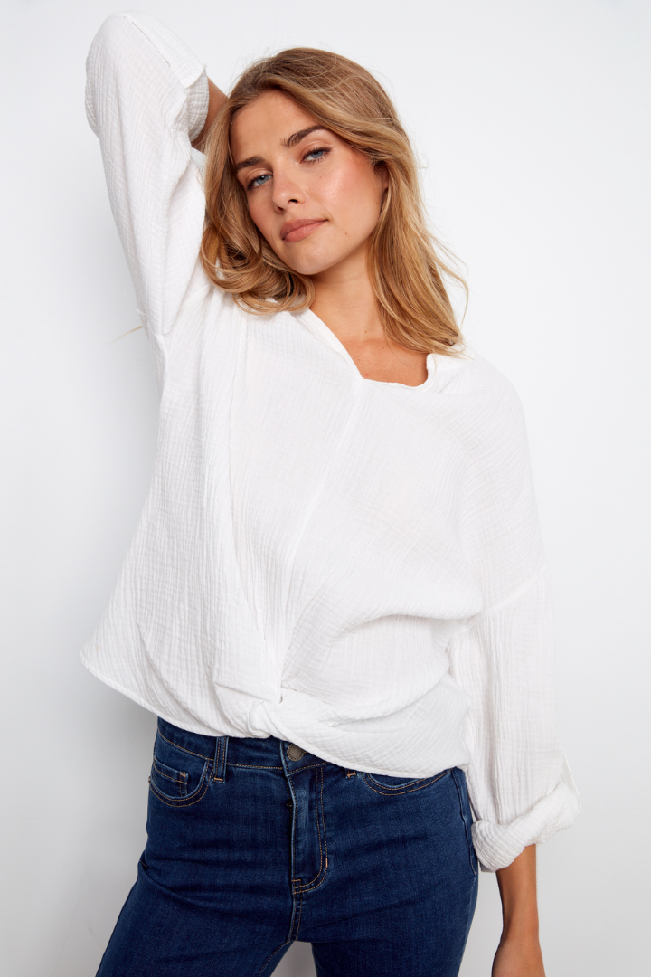 Regular price $94.51Effortlessly chic and wonderfully breathable, this cotton gauze top pairs beautifully with everything from tailored linen trousers to casual denim. The knotted front detail adds understated sophistication while the relaxed silhouette keeps you comfortable all day long. Perfect for warm weather styling.