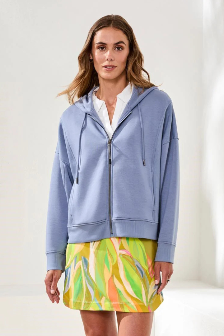 Elevate your everyday wardrobe with this dust blue hooded jacket, engineered from luxurious scuba knit that adapts to your active lifestyle. Featuring a convenient full-zip closure and responsive stretch fabric, it layers beautifully over anything while maintaining its sumptuous softness. Perfect for transitioning between gym sessions and casual outings, this refined essential combines comfort with contemporary style—the versatile piece you'll reach for again and again.