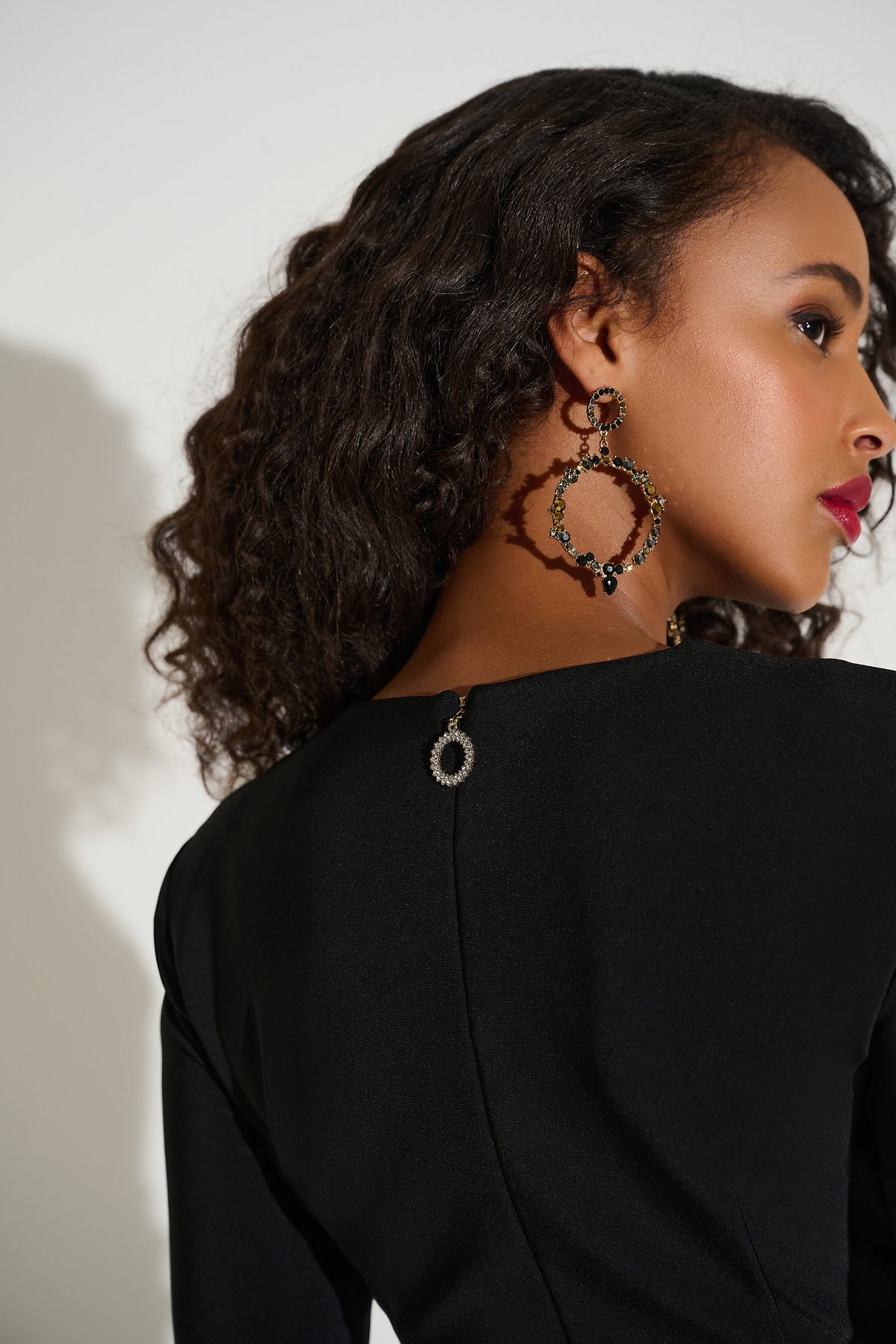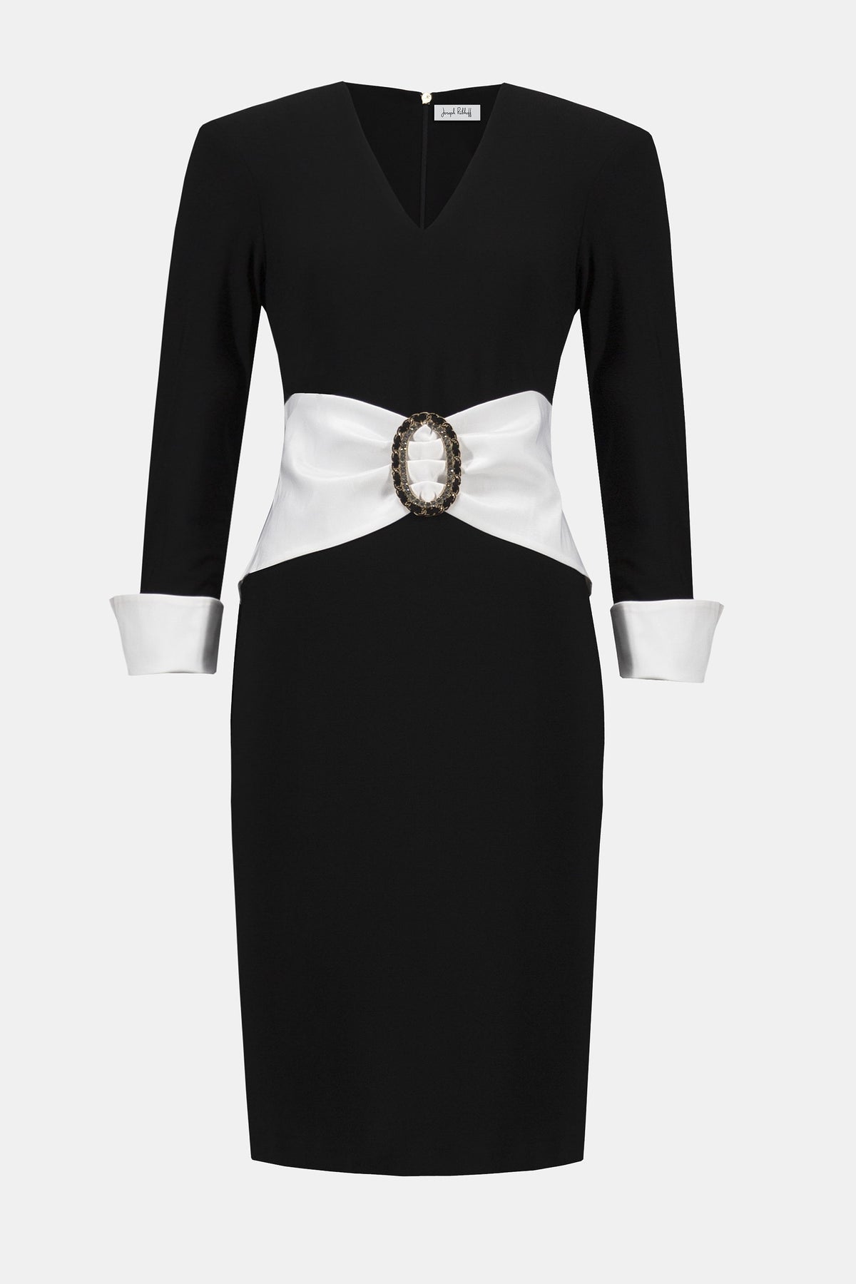 Stand out at any event in this exquisite occasion dress, featuring a striking front waist insert accentuated by a beautiful buckle centerpiece. It showcases a flattering V-neckline, refined long cuffed sleeves, and a stylish hem that falls just below the knee, embodying classic elegance. Made from a sumptuous combination of silky knit and stretch taffeta, this sheath dress delivers both comfort and sophisticated style, making it truly unique.