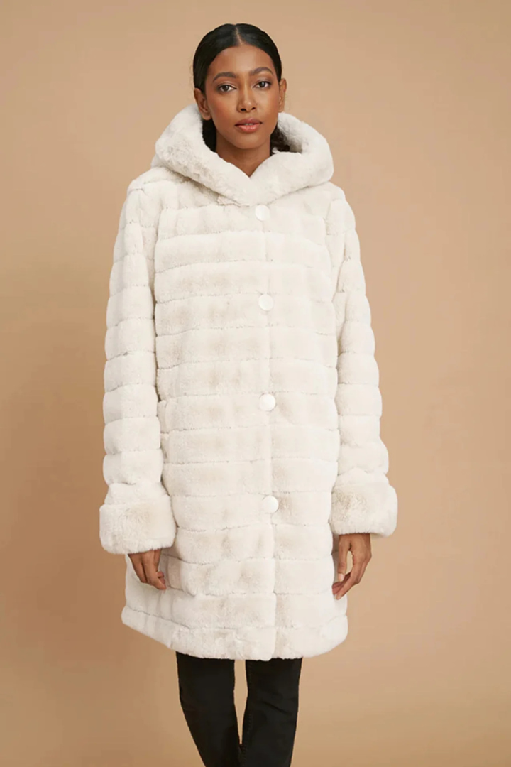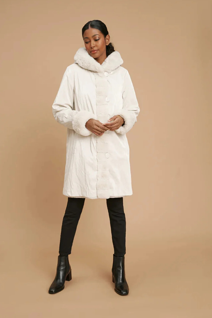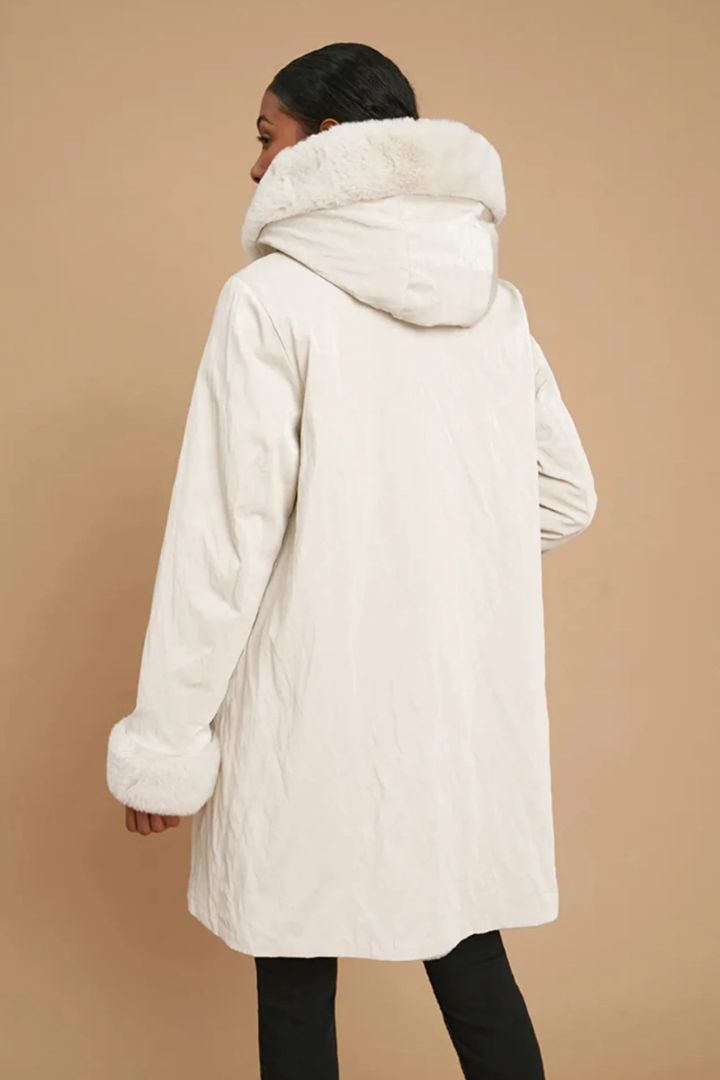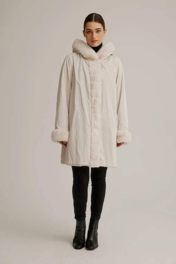 Regular price $435.16Discover dual-sided elegance with this reversible faux fur coat that transforms your evening aesthetic. Crafted in a luminous cream tone with subtle shimmer, the plush texture delivers both warmth and refined sophistication. Flip between two distinct looks—rich, inviting warmth on one side and understated glamour on the other—making this versatile piece your go-to for any occasion. Experience the perfect balance of cozy comfort and polished style that effortlessly elevates your wardrobe.