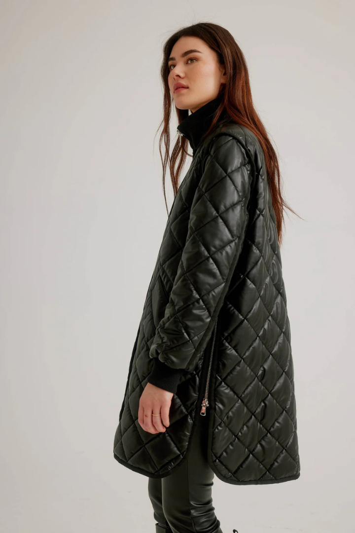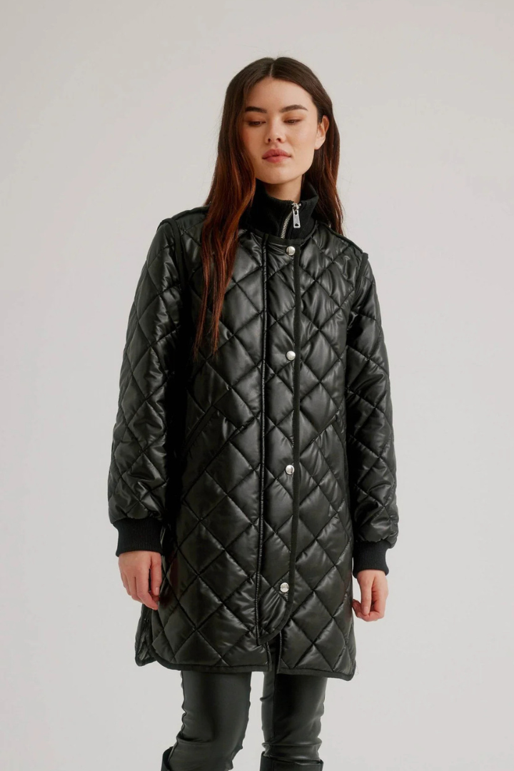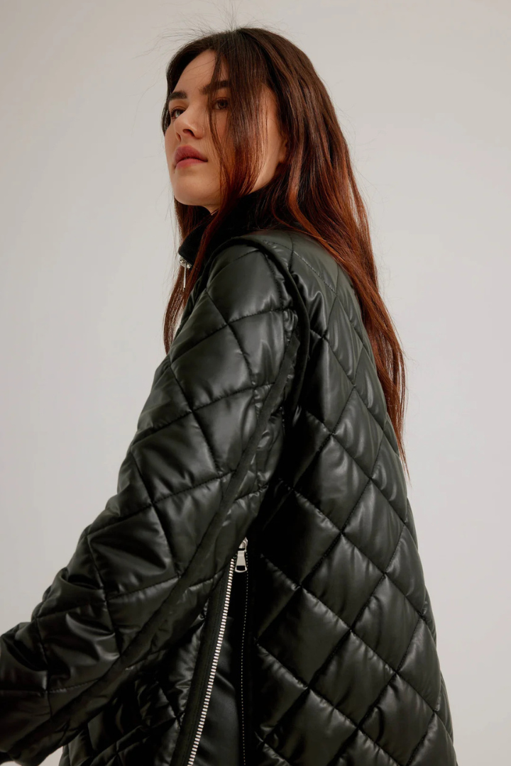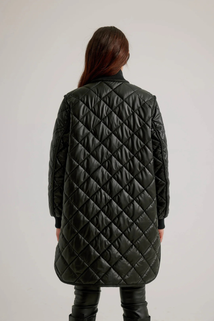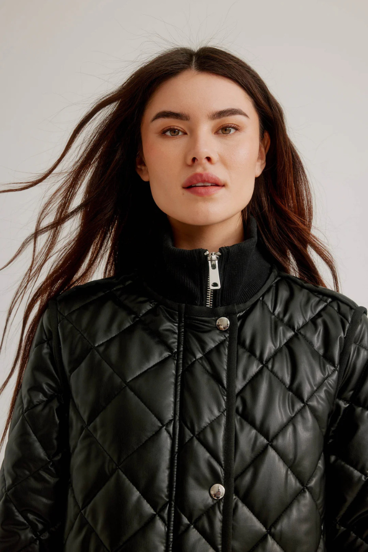 Elevate your outerwear game with this striking vegan leather quilted coat that seamlessly blends edge and elegance. The diamond quilting pattern creates visual interest while the zip front closure ensures effortless styling. Thoughtful details—including snap placket reinforcement, strategic side zips, ribbed cuffs, and a structured collar—deliver both security and sophistication. Finished with refined grosgrain trim, this coat transforms any outfit into a polished statement. Perfect for those who refuse to compromise on style or ethics.