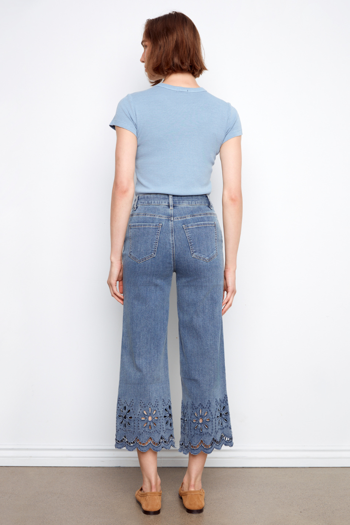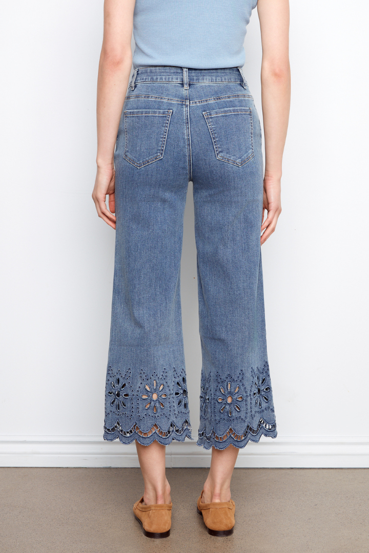 Wide Leg Jeans With Scalloped Eyelet Hem - Medium Blue