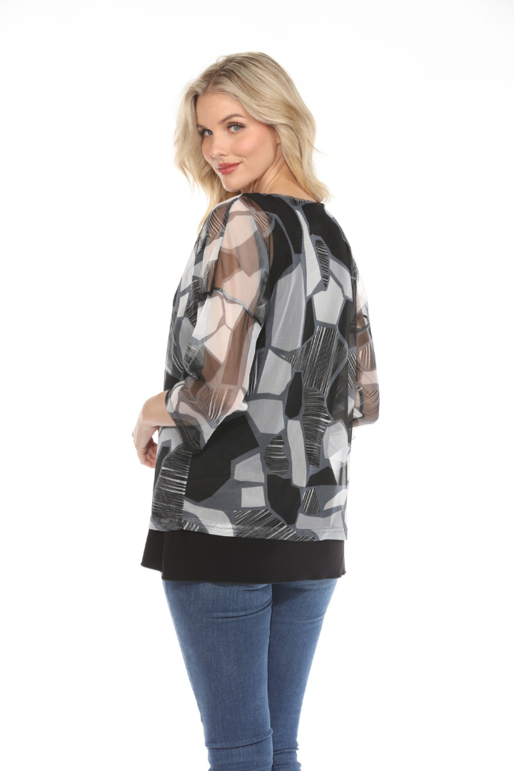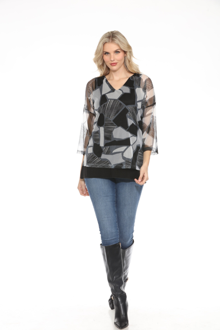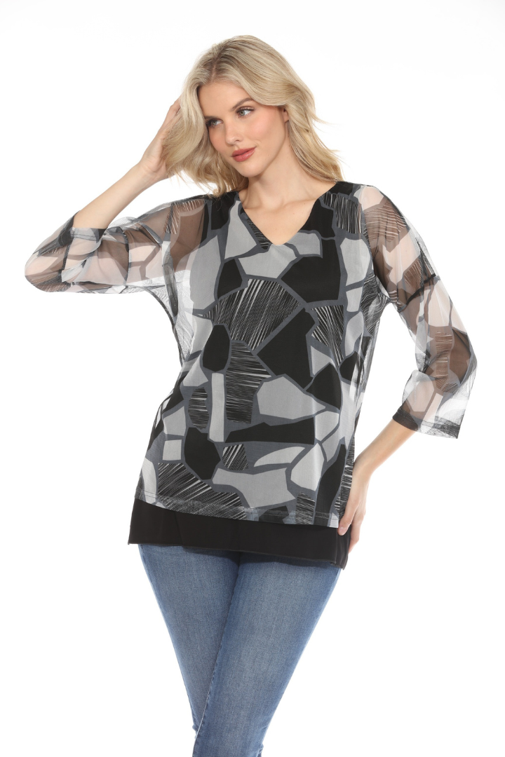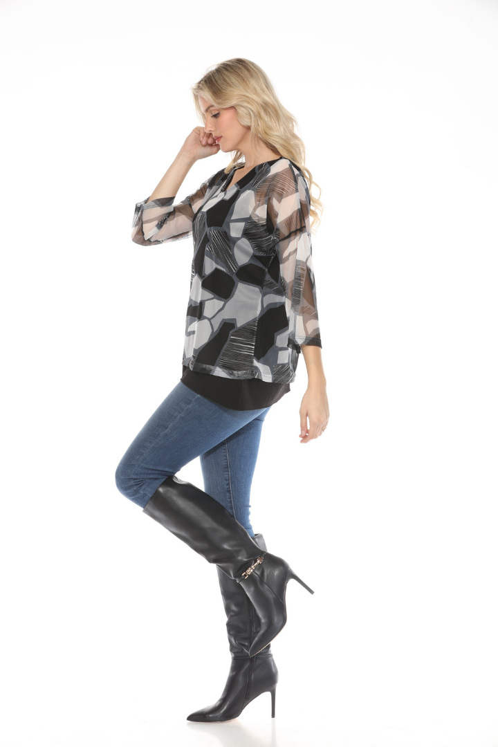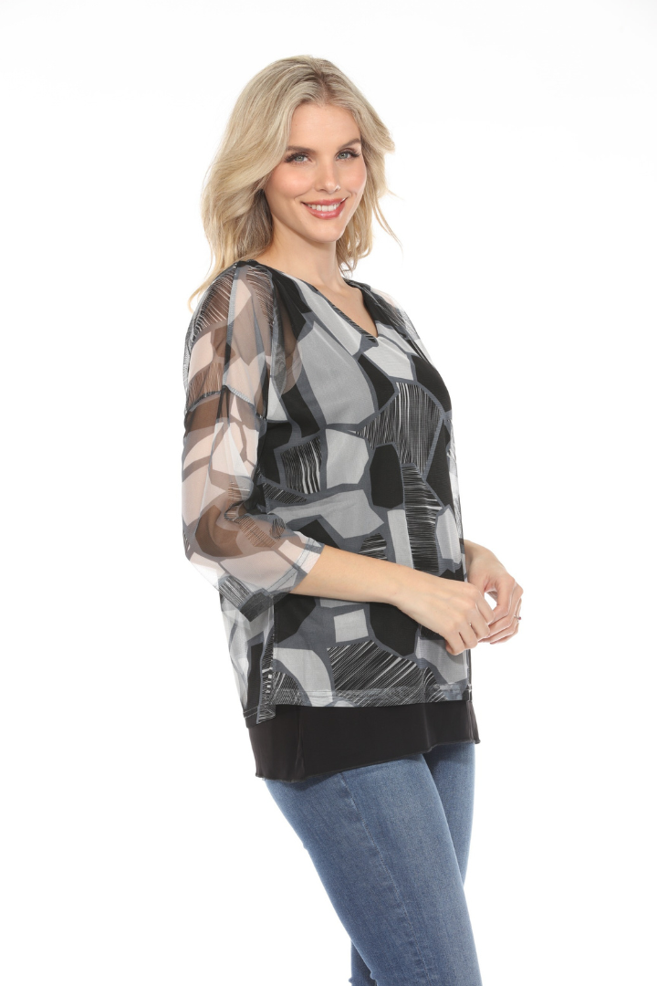 Elevate your wardrobe with this Printed Sheer Overlay Top in classic black and white. Featuring a flattering V-neck and delicate sheer fabric, it adds a touch of elegance while enhancing your silhouette. Perfect for layering, this top blends style and comfort effortlessly, making it a versatile choice for both casual and dressier occasions.