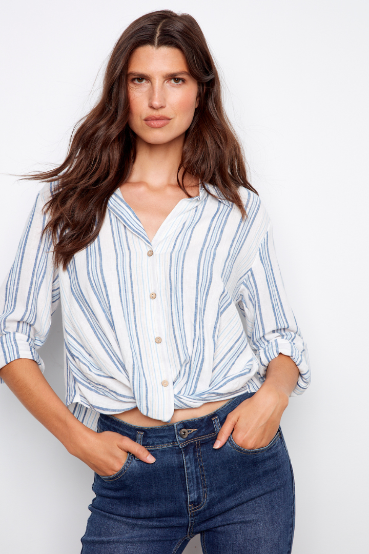 Effortless style meets comfort in this striped linen top, designed for those who value ease without sacrificing elegance. The front twist detail adds a flattering, modern touch while the breathable linen fabric keeps you cool and comfortable all day long. Perfect for casual outings or dressed up for weekend adventures, this denim-toned blouse transitions seamlessly from day to night. Lightweight and versatile, it's the go-to piece your wardrobe has been waiting for.