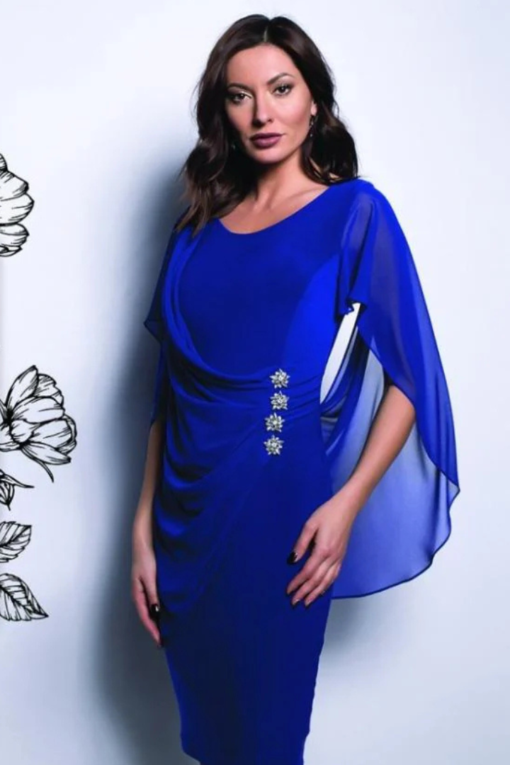 Make a graceful entrance in this Frank Lyman dress, designed for those who appreciate refined elegance at formal and semi-formal occasions. The knee-length cut features a stunning sheer cape back that adds drama while providing flattering coverage, complemented by a round neckline. Jeweled embellishments and strategic ruching elevate the understated solid palette, creating a polished look that demands attention. Versatile enough for multiple events, this timeless piece is your go-to for effortless sophistication—slip it on and you're ready to shine.