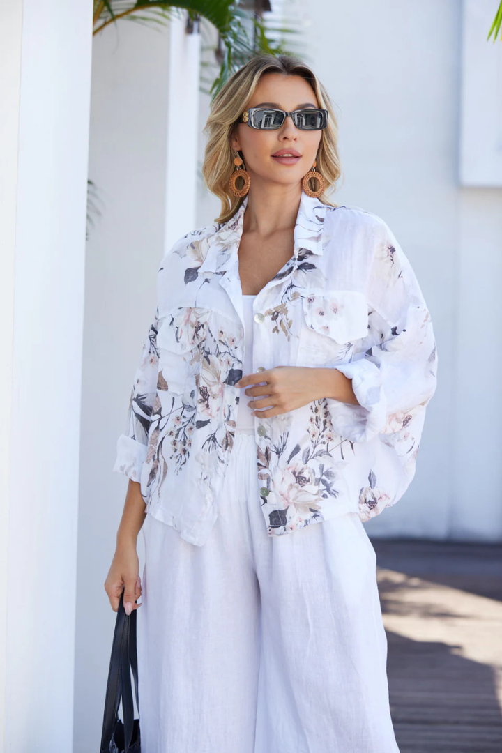Regular price £71.66Effortlessly transition from day to night in this versatile linen jacket, featuring an elegant sepia leaf print that adds artistic flair to any outfit. Crafted from breathable linen, it's perfect for layering over dresses, tees, or tanks while keeping you cool and comfortable. The crisp white base complements both casual and polished looks, making it an essential piece for spring and summer wardrobes. Whether you're heading to brunch or an evening event, this printed jacket delivers timeless style with modern appeal.