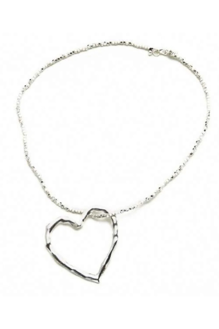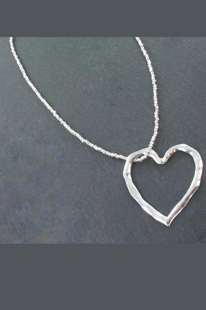 Crafted by artisans in Bali, this elegant silver plate necklace features a delicate beaded chain leading to an open heart pendant. The secure lobster clasp ensures reliable wear, while the ethically sourced materials reflect thoughtful craftsmanship. A timeless piece that combines meaningful design with quality construction. One size fits all.