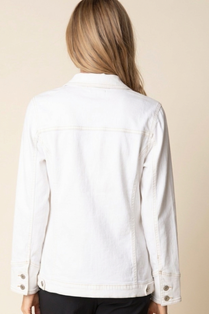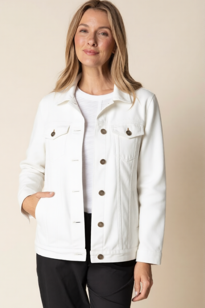 A timeless white denim jacket crafted from stretch fabric for all-day comfort and effortless movement. The relaxed fit pairs seamlessly with everything from casual tees to dresses, making it a versatile wardrobe essential. Perfect for layering through seasons or throwing on for an instant style upgrade.