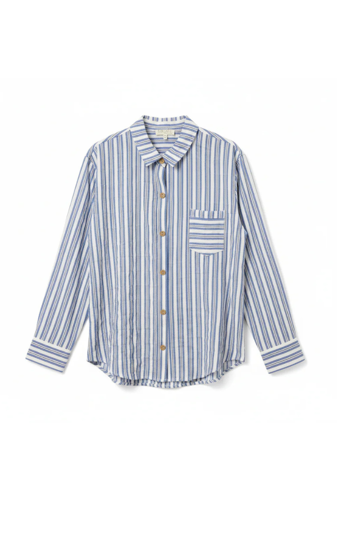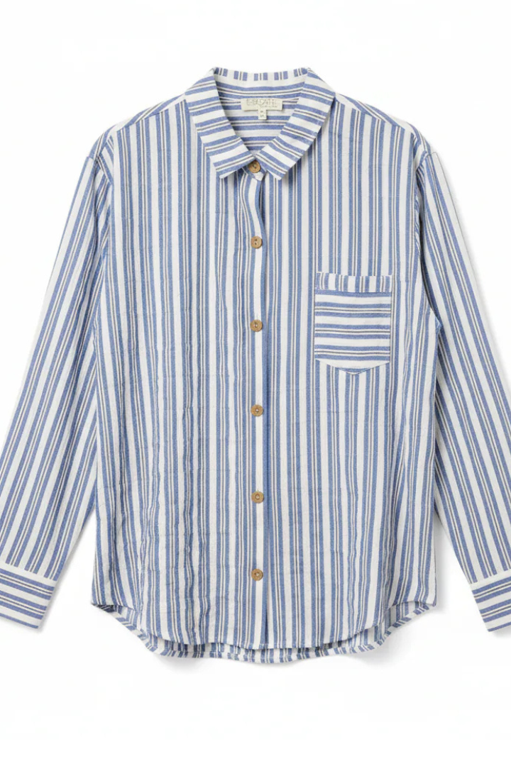 Elevate your everyday wardrobe with this effortlessly chic striped shirt, featuring natural coconut buttons that add warmth and character. The crisp fabric drapes beautifully in a denim friendly blue tone, making it the perfect layering piece for any occasion. Whether dressed up or down, this versatile essential delivers timeless style with understated elegance.