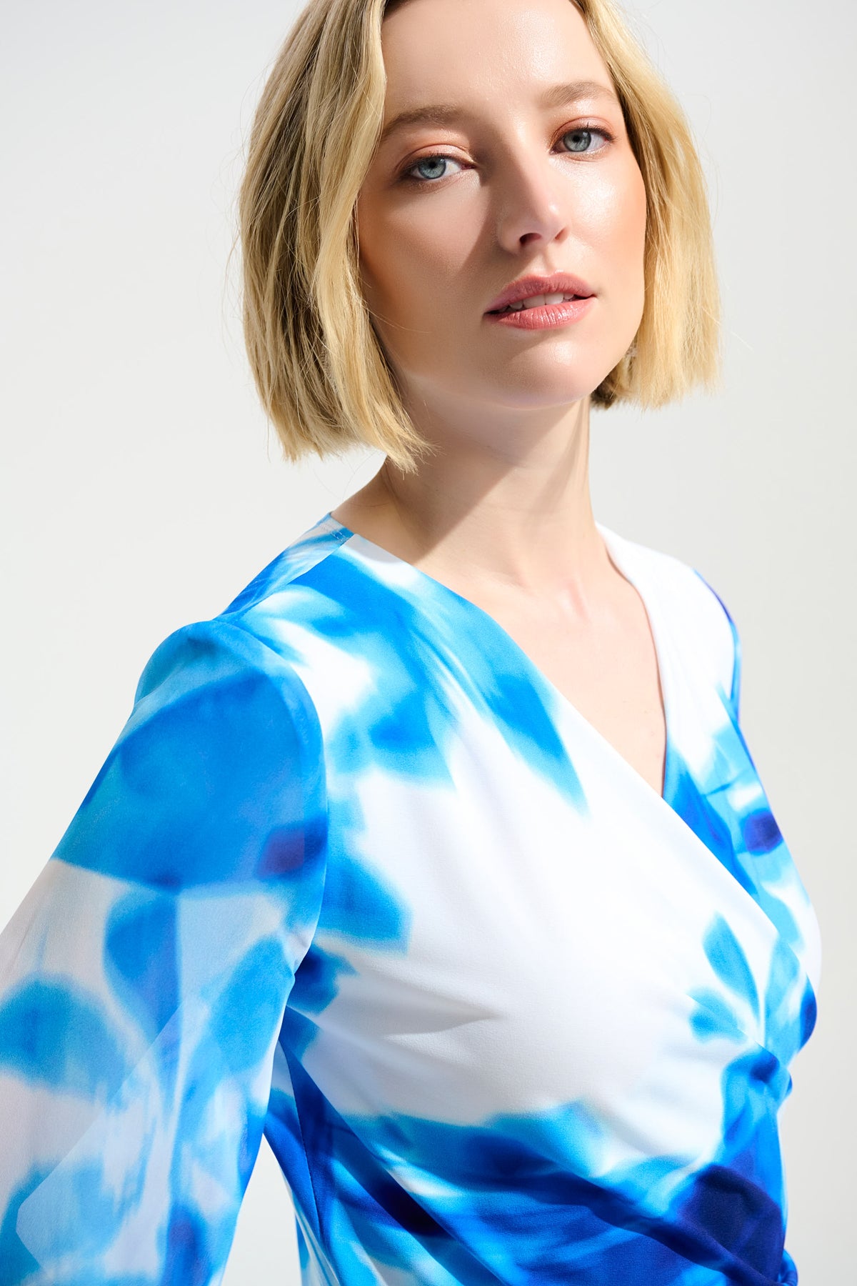 Effortlessly elegant, this Joseph Ribkoff wrap top combines silky knit fabric with chiffon sleeves for a refined, feminine look. The flattering v-neckline and hip-length cut work beautifully with the floral and abstract print, while wrap and ruched details add dimension and sophistication. Long flare sleeves create graceful movement, making this versatile top perfect for casual days or evening occasions. A wardrobe essential that transitions seamlessly from event to event.