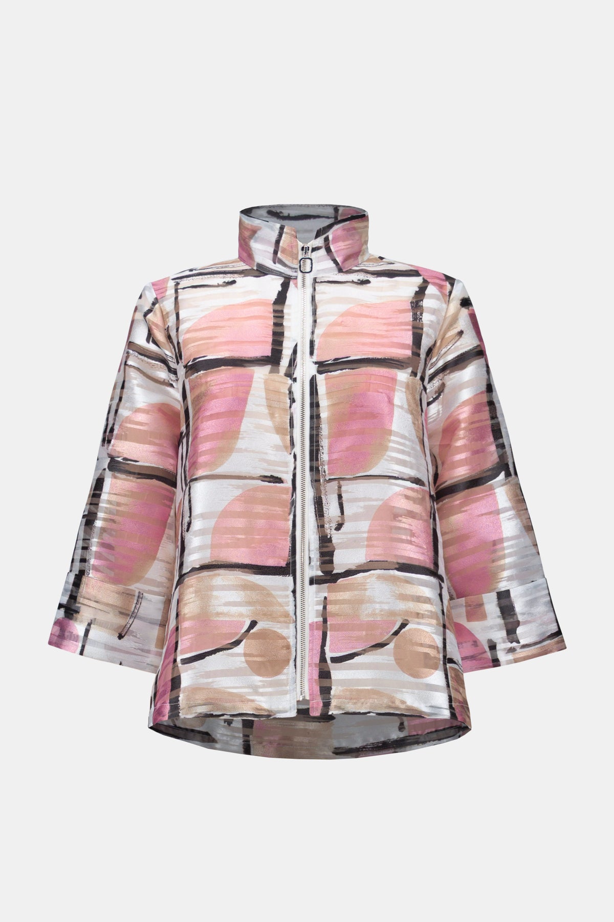 Elevate your wardrobe with this stunning Joseph Ribkoff jacket that effortlessly transitions from day to night. The bold abstract print on luxurious organza fabric makes an instant statement, while the tailored boxy silhouette flatters every frame. Designed with practical 3/4 sleeves, a polished collar, and functional pockets, this hip-length piece delivers versatility without compromising on style. The smooth zipper closure ensures easy layering, making it your go-to jacket for adding dimension to casual outfits or dressing up your favorite basics. Sophisticated, wearable, and undeniably chic.