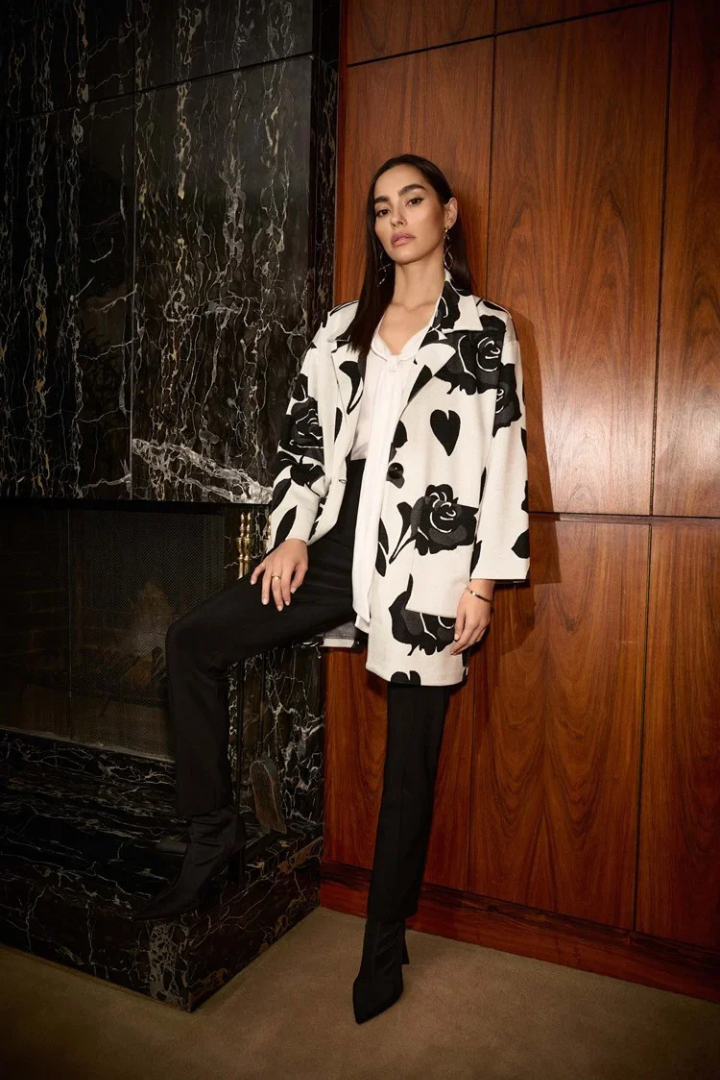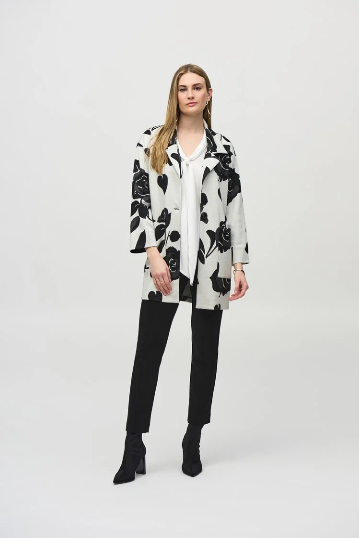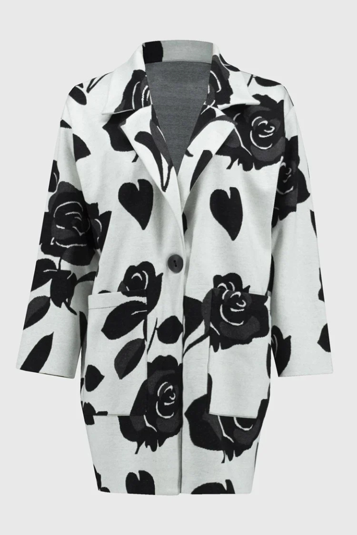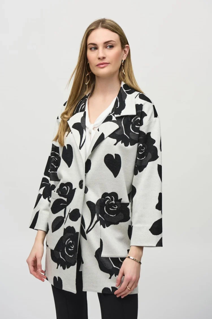 Stand out effortlessly in this eye-catching jacquard sweater knit coat featuring a captivating floral pattern and a sharp notched collar that enhance its stylish charm. Finished with elegant applied pockets and a single-button closure, this jacket delivers a refined and sophisticated appearance.