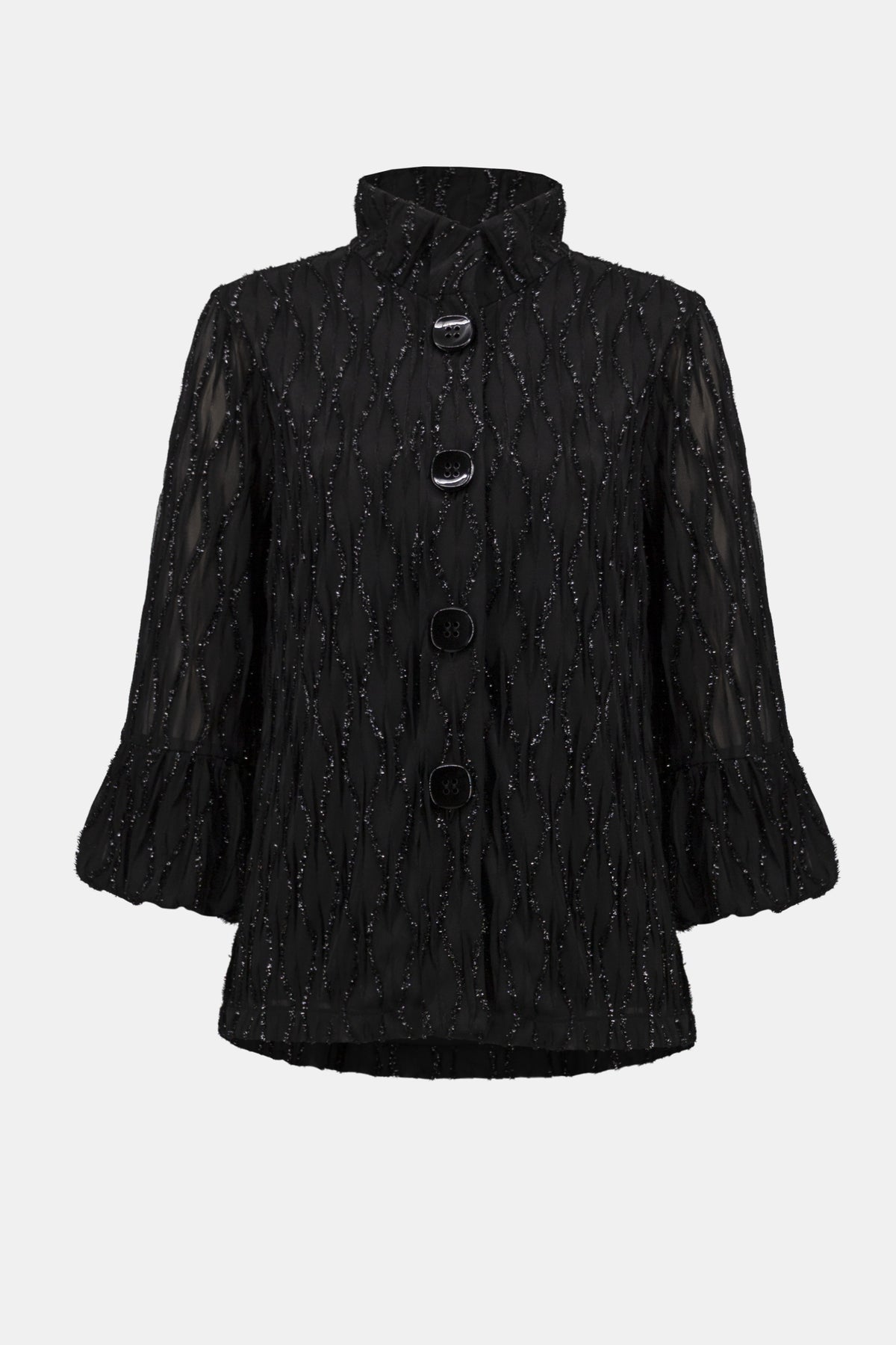 The Lurex Cascade Trapeze Jacket & Pant Set effortlessly blends sophistication and comfort, making it a standout addition to your wardrobe. The jacket’s chic stand collar and sleek front button closure highlight your elegant silhouette, while the puffed cuffs add a touch of dramatic flair and unique charm. Complementing the jacket, the wide-leg Lurex cascade pants flow gracefully with every step. Designed with a front-folded waistband and an elastic back, these pull-on pants ensure both a flattering fit and all-day comfort. This set promises to elevate your style for any occasion with its luxurious fabric and impeccable tailoring.