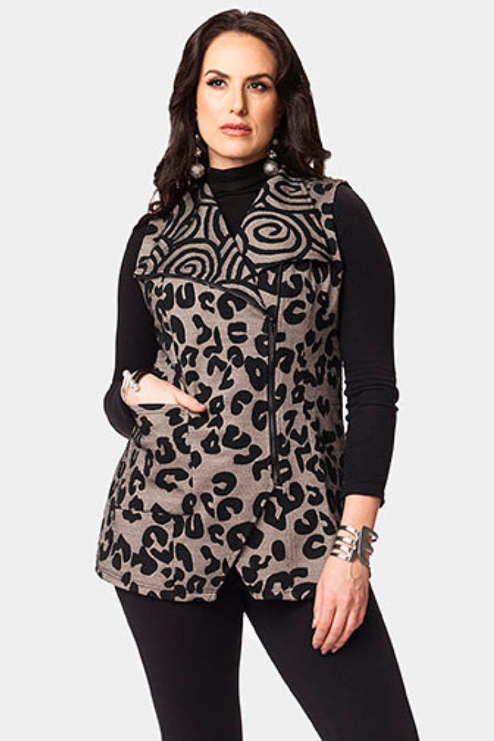 Regular price $79.72Elevate your layering game with this striking Front Zip Sleeveless Vest in a bold panther mixed print. The convenient front zip allows for effortless styling versatility, while a practical pocket keeps your essentials within reach. Perfect for throwing over your favorite tee or pairing with a dress, this sleek vest adds instant edge and dimension to any outfit. A wardrobe essential that transitions seamlessly from casual to chic.