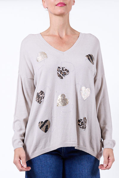 Heart Embellished Print Top - Beige