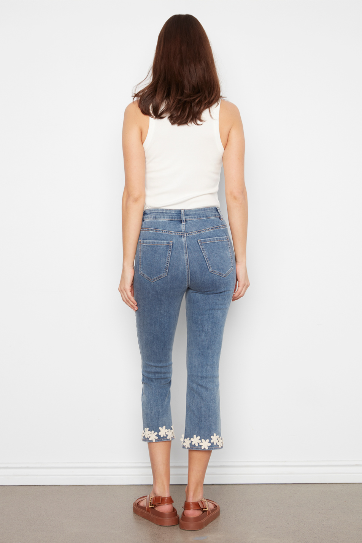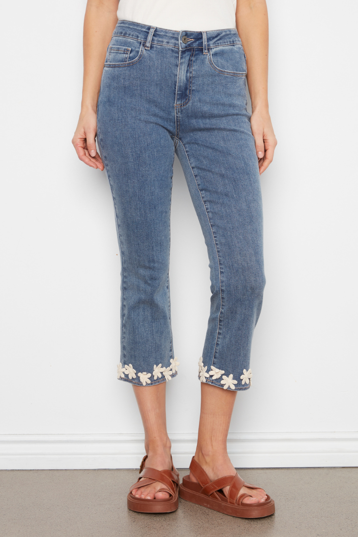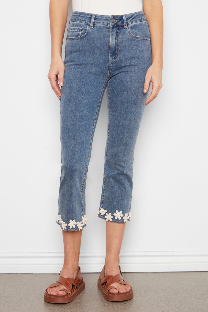 Elevate your everyday look with these stunning Floral Hem Jeans in classic denim. The delicate floral detailing along the hem adds an unexpected touch of elegance, while the slim silhouette flatters your figure with a sleek, polished fit. Perfect for dressing up casual outfits or creating effortless sophistication, these jeans blend timeless style with modern charm. A versatile wardrobe essential that transitions seamlessly from day to night.