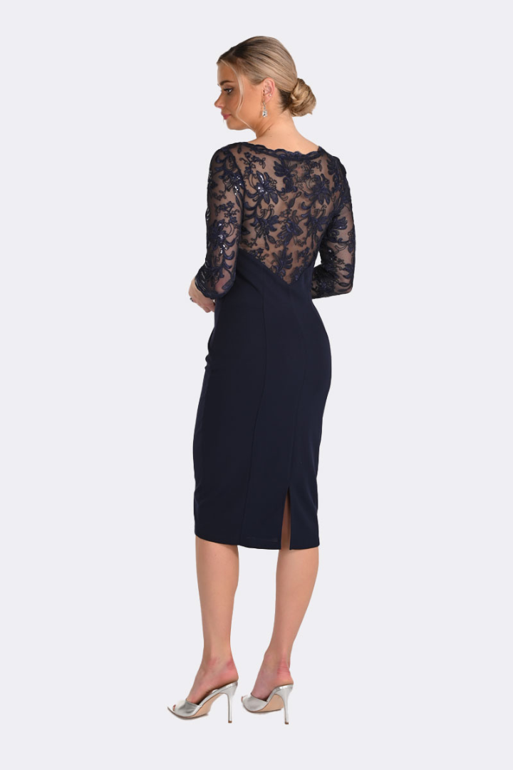 Regular price $290.00Make an unforgettable entrance with this breathtaking midnight navy sheath dress—a masterclass in elegance and allure. While the front offers a clean and sophisticated aesthetic, the back reveals a stunning, plunging V-shaped lace insert that creates a sheer, ethereal effect. The intricate floral lace is subtly embellished with tonal sequins, catching the light with every turn. Designed by Frank Lyman, this piece is the ultimate choice for the woman who appreciates a classic silhouette elevated by dramatic, romantic detailing.