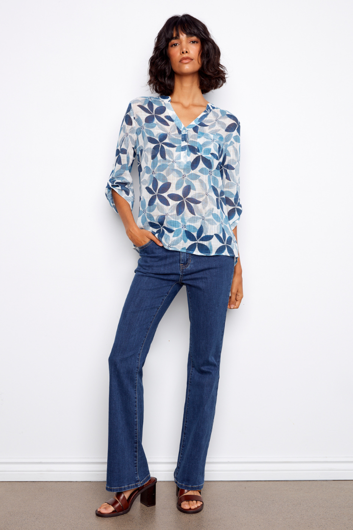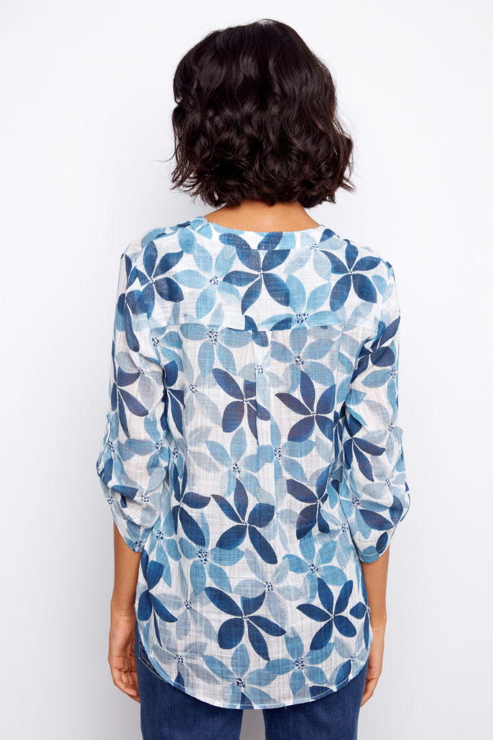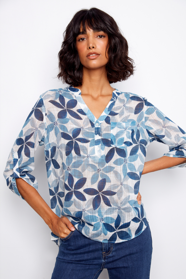 Elevate your everyday wardrobe with this best-selling printed cotton half button blouse in a stunning sapphire hue. Crafted from 100% pure cotton, it delivers breathable comfort that moves with you throughout the day. The lightweight fabric makes it perfect for layering or wearing solo, while the half button design adds effortless style and versatility. Whether you're dressing up for the office or keeping it casual, this timeless piece transitions seamlessly from season to season. A wardrobe essential that combines comfort, quality, and undeniable appeal.