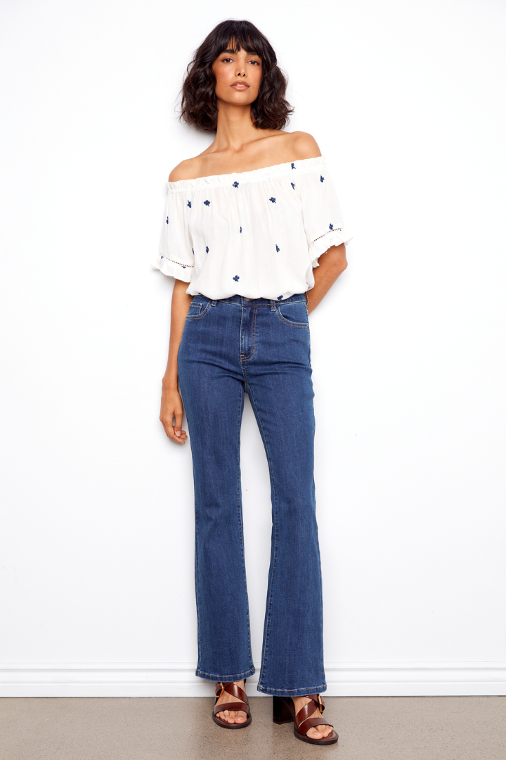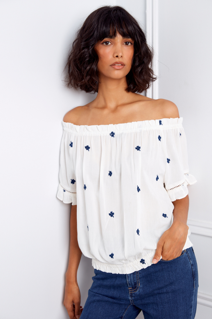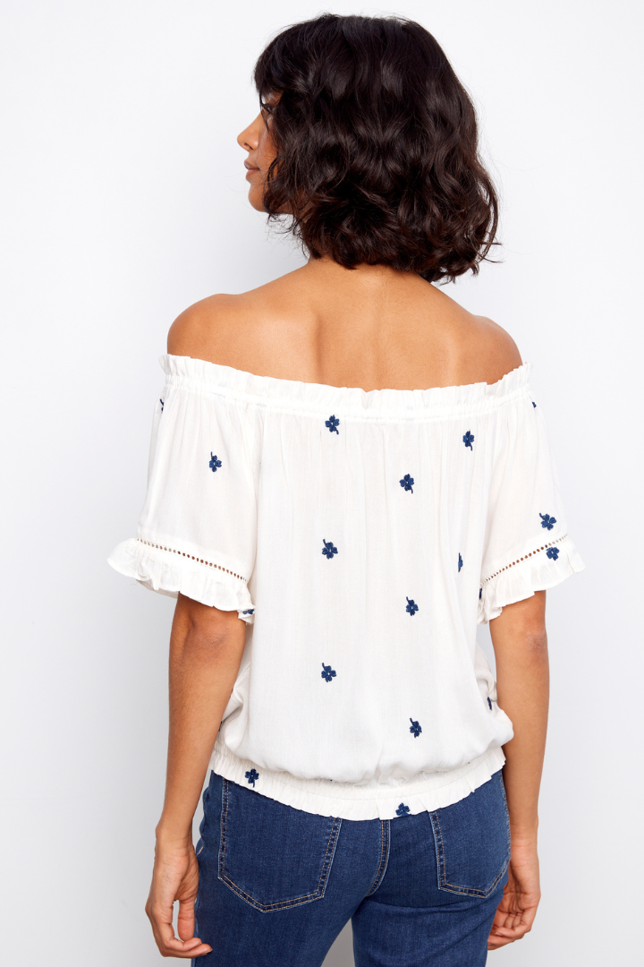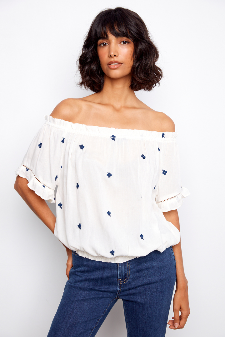 Discover effortless elegance with this Charlie B off-shoulder blouse. Featuring ruffled short sleeves, an elasticized ruffled hem, and delicate embroidered floral details, this piece combines style with comfort. Crafted from breathable, lightweight woven viscose, it drapes beautifully in a relaxed fit that's perfect for casual days or dressed-up occasions. Pair it with your favorite denim for an instantly polished look.