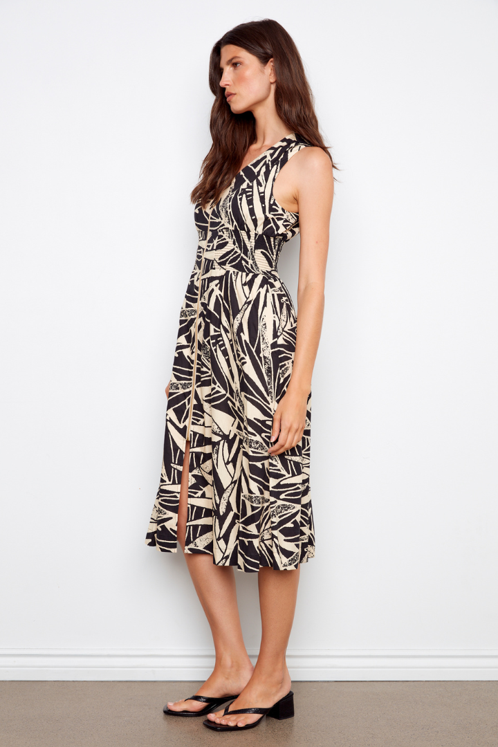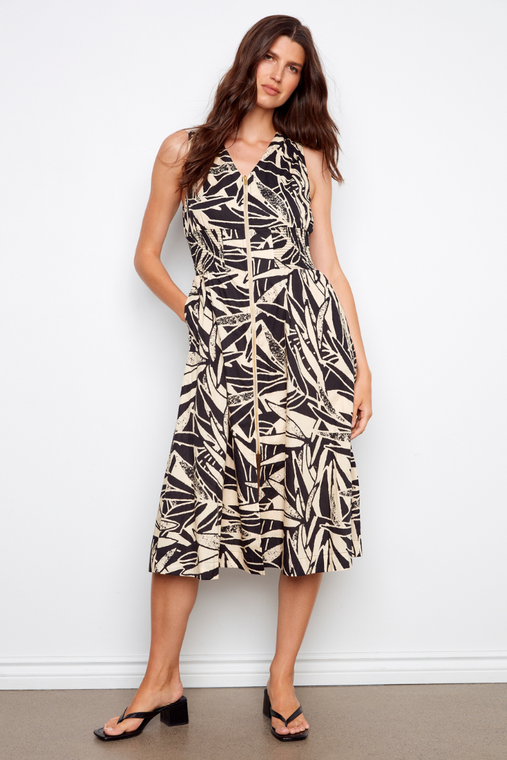 Versatile and effortlessly chic, the Sleeveless Printed Front Zip Dress in Luna transitions seamlessly from casual to dressed-up occasions. The flattering silhouette works beautifully on its own or layered with a bolero for added dimension and style. Perfect for anyone seeking a go-to piece that adapts to any setting.