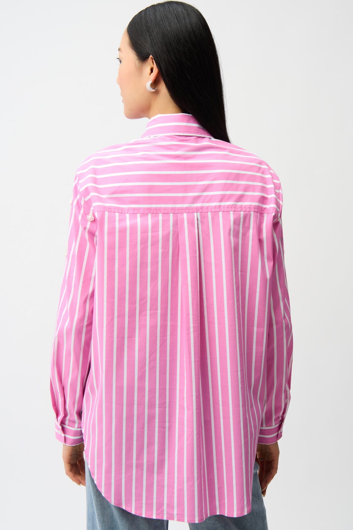 Elevate your everyday wardrobe with this Joseph Ribkoff boxy blouse, where understated sophistication meets modern edge. The refined striped design pairs beautifully with delicate rhinestone accents that catch the light, while stretch cotton fabric moves with you throughout your day. Featuring a relaxed fit, classic collar, and button front, this hip-length piece transitions seamlessly from the office to weekend gatherings. Long sleeves and a structured silhouette create a polished appearance that works harder than ordinary basics—dress it up or down and always look intentional.