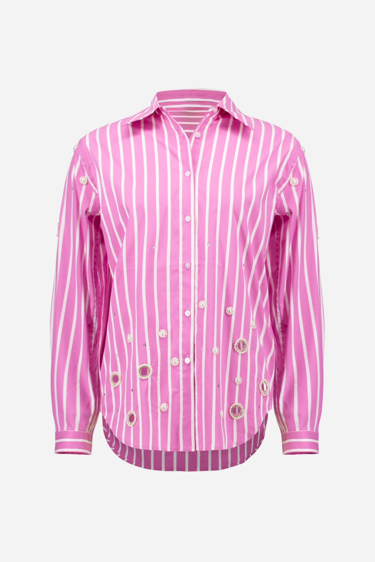Stretch Cotton Stripe Print Boxy Blouse With Rhinestones Style 261966