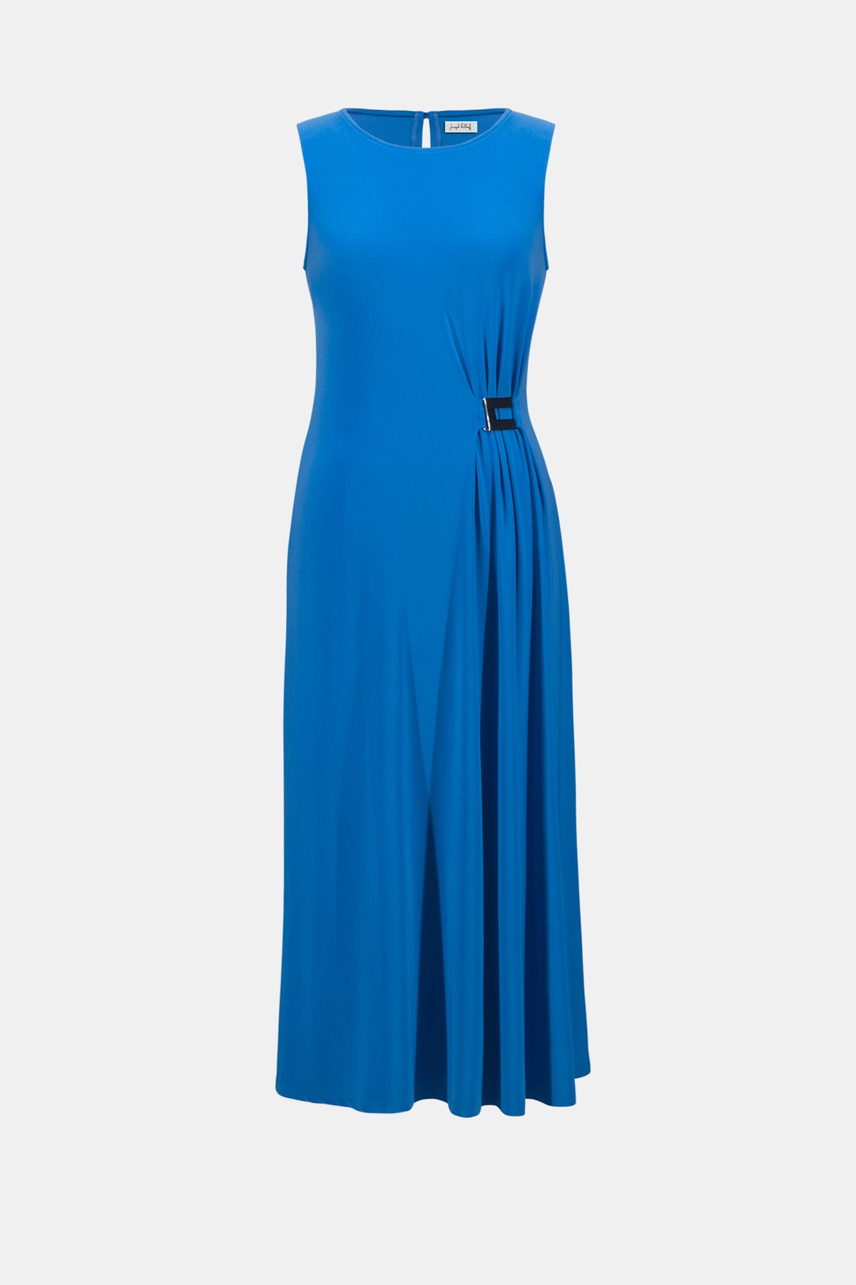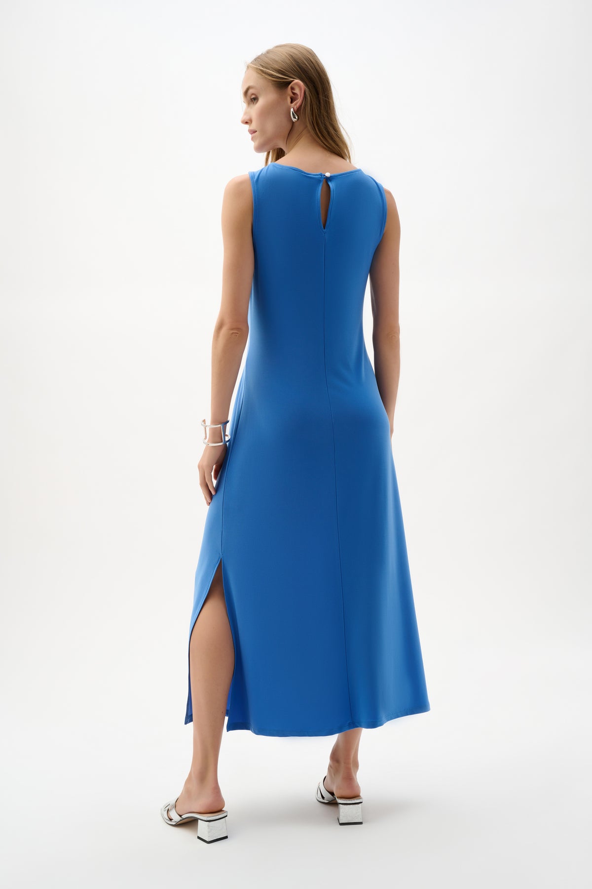 Discover the Joseph Ribkoff Trapeze Dress, an elegant maxi silhouette that captures effortless sophistication. This refined A-line piece features a graceful round neckline and sleeveless cut, complemented by a sculpted belted waist and subtle slit detail. The understated palette and timeless design make it a versatile essential for any curated wardrobe. Perfect for elevated casual moments and warm-weather elegance.